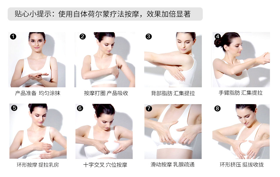 3. each side of the chest ring massage 10 minutes is better, until the product is completely absorbed;